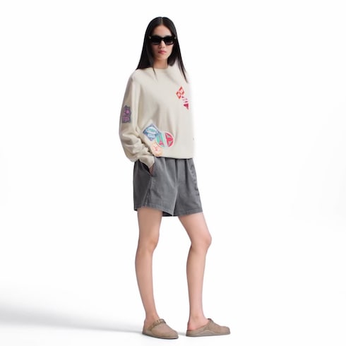 Thuộc bộ sưu tập Flight Mode, mẫu áo len bằng chất liệu Cashmere được biến tấu với các chi tiết vui tươi mang tinh thần viễn du, điểm xuyết lai áo bo sọc gân cổ điển. Điểm nhấn nổi bật nằm ở hình in nhãn du lịch được thêu tỉ mỉ với dòng chữ Louis Vuitton, mang đến dấu ấn bắt mắt và tôn vinh di sản của Maison.