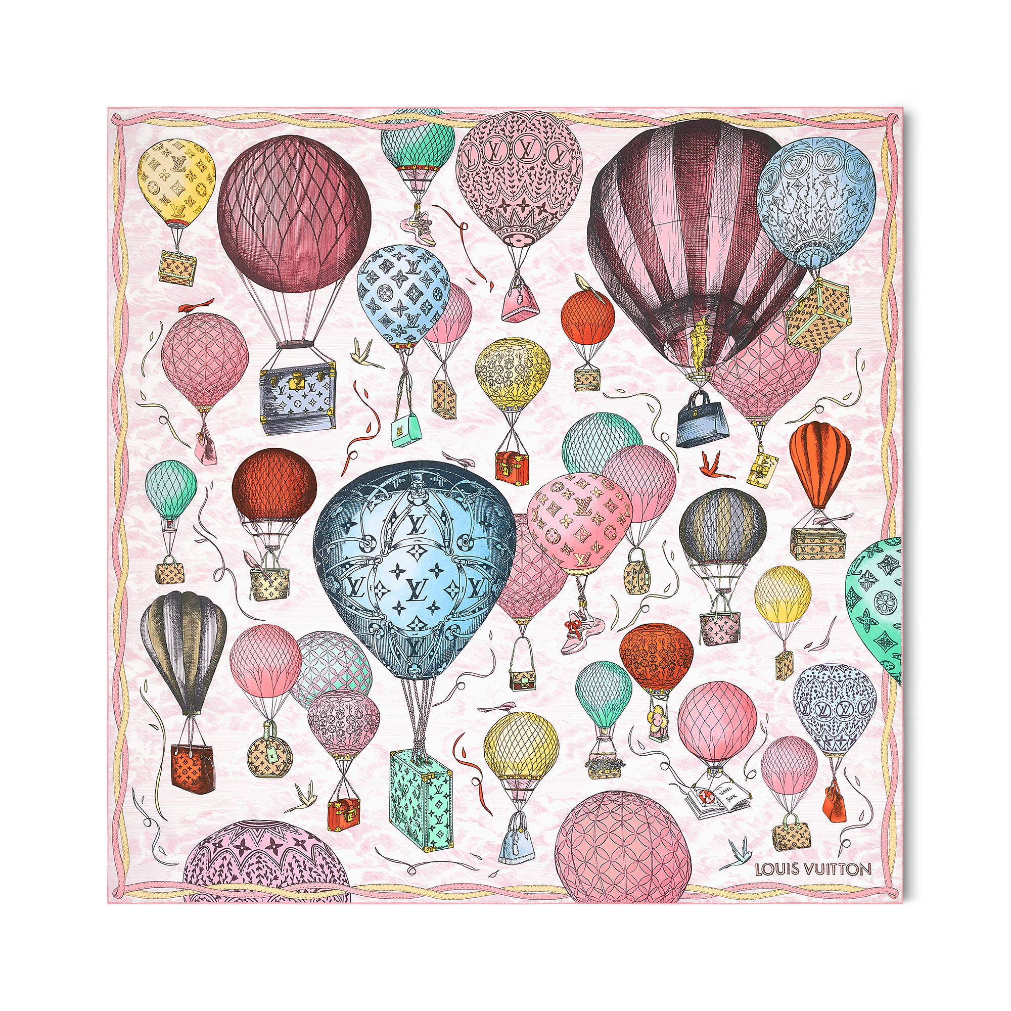 Mẫu khăn lụa vuông Up And Away 90 được lấy cảm hứng từ di sản viễn du của nhà mốt. Trên chất liệu lụa nguyên chất, các hình ảnh khinh khí cầu được trang trí họa tiết Monogram, bên dưới các khinh khí cầu là rương, túi xách và vali Louis Vuitton. Hội tụ đầy đủ những biểu tượng của nhà mốt, chiếc khăn lụa là gợi ý quà tặng tuyệt vời.