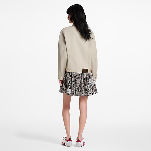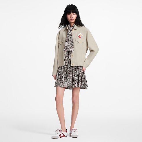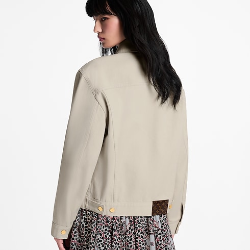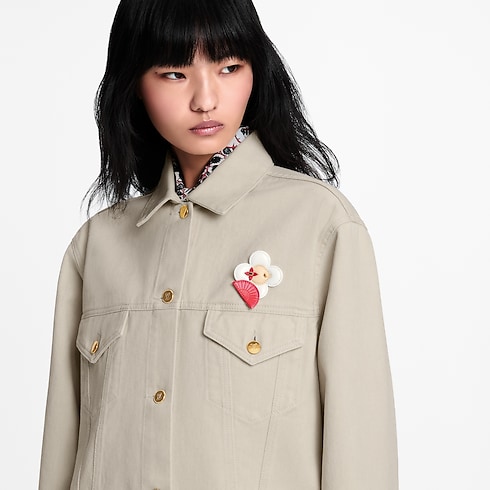 Mẫu áo khoác mang đến sức hút thanh lịch cho bộ trang phục hàng ngày nhờ chất liệu vải Cotton Garbadine mềm mại trong gam màu be nhẹ nhàng, kết hợp các chi tiết kim loại màu vàng sang trọng. Cổ áo cùng hai túi có nắp gập phía trước tôn lên phom dáng tinh tế, trong khi miếng da Vivienne nhiều màu sắc ở ngực tạo điểm nhấn cá tính đầy nghệ thuật.