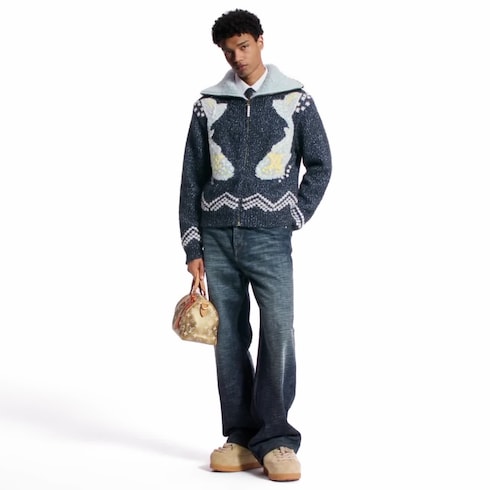 Thuộc bộ sưu tập Thu-Đông 2025 do Giám đốc sáng tạo Pharrell Williams hợp tác sản xuất với nhà thiết kế Nigo, mẫu áo khoác gây ấn tượng với mô típ thêu và dệt kiểu Intarsia tinh xảo, tôn vinh di sản của Nhật Bản - quê hương của Nigo. Nổi bật ở thân trước là đôi cá Koi lồng ghép logo LV, kết hợp với hoa anh đào cùng chữ tiếng Nhật ở phía sau. Áo được may từ hỗn hợp Cotton-len dệt kim trong gam màu xanh dương sẫm, tô điểm đầu khóa kéo đính ngọc trai sang trọng.