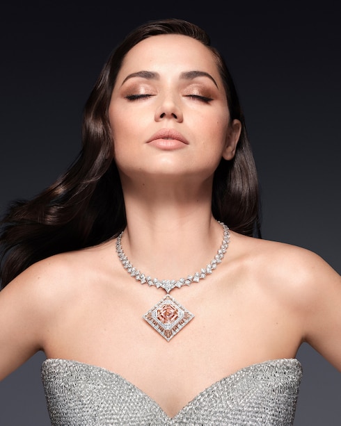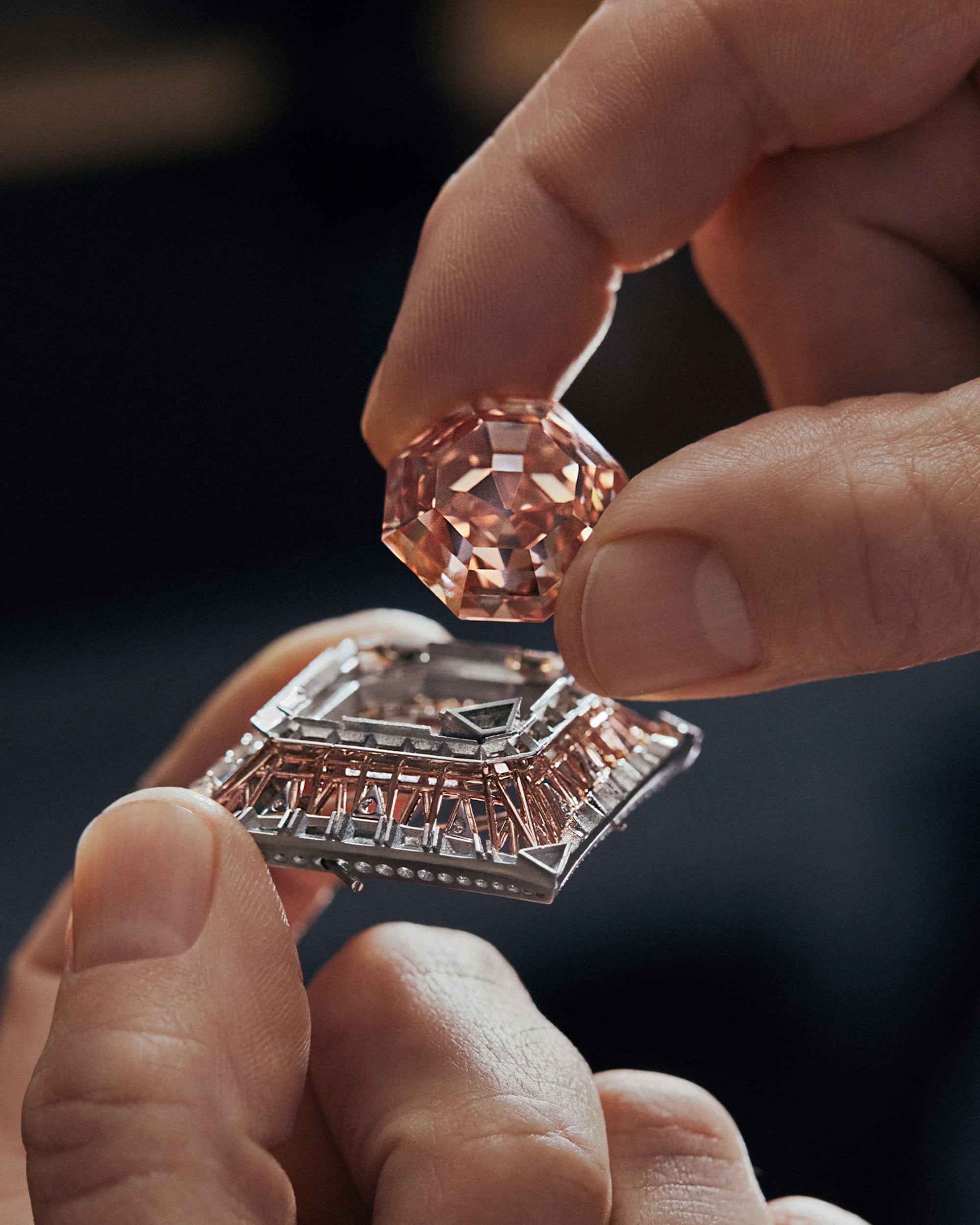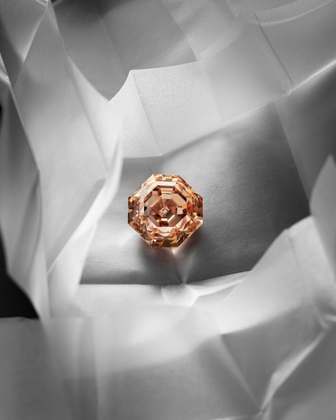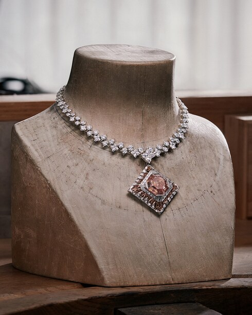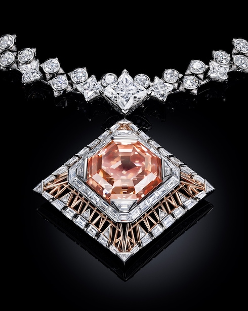 Điểm nhấn cho vẻ đẹp hoàn mỹ của tuyệt tác này là viên kim cương nặng 56,23 carat, mang sắc hồng độc đáo pha chút cam nâu – một kỳ quan tự nhiên được tôn lên nhờ đường cắt tinh xảo và bề mặt đá cỡ lớn.