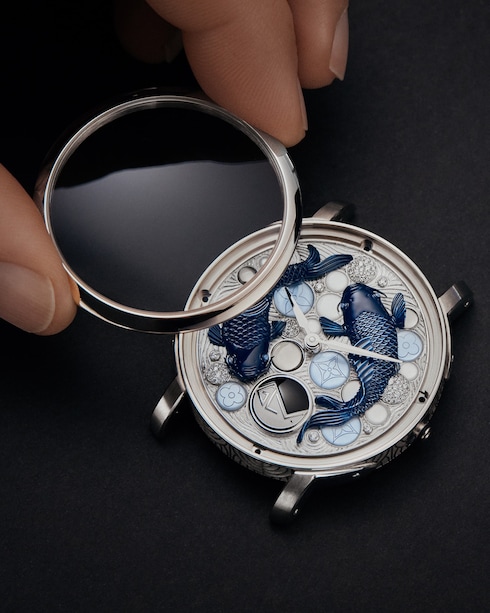 Là biểu tượng của lòng dũng cảm và kiên trì, chiếc đồng hồ phiên bản giới hạn bằng vàng trắng này tái hiện hình ảnh hai chú cá chép uốn lượn hài hòa trong các tông màu xanh dương sẫm và bao quanh là những viên đá quý nhiều màu sắc. Từ sự chính xác đến từng chi tiết nhỏ trong kỹ thuật chạm khắc mặt số đến dây đeo bằng da bê được thiết kế để tái hiện chuôi kiếm Katana bện da của Nhật Bản, tuyệt tác Métiers d'Art này thể hiện tay nghề thủ công vô song của La Fabrique des Arts.