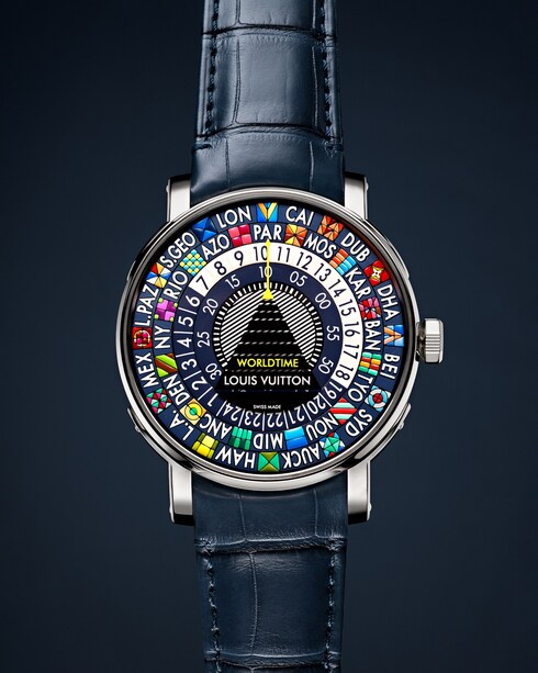 Lấy cảm hứng từ những chiếc rương kinh điển của Louis Vuitton, đồng hồ Escale Worldtime được thiết kế dành cho những tín đồ dịch chuyển. Chữ viết tắt tên thành phố đại diện cho múi giờ, trong khi phút được hiển thị bên dưới mũi tên màu vàng chỉ thời gian của thành phố tham chiếu. Tại xưởng sản xuất La Fabrique du Temps Louis Vuitton, các nghệ nhân lành nghề phải mất 40 giờ đồng hồ để sơn thủ công từng mặt số.