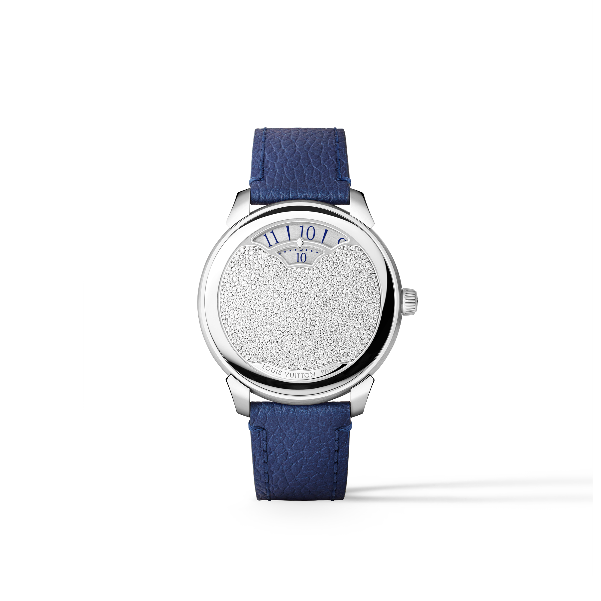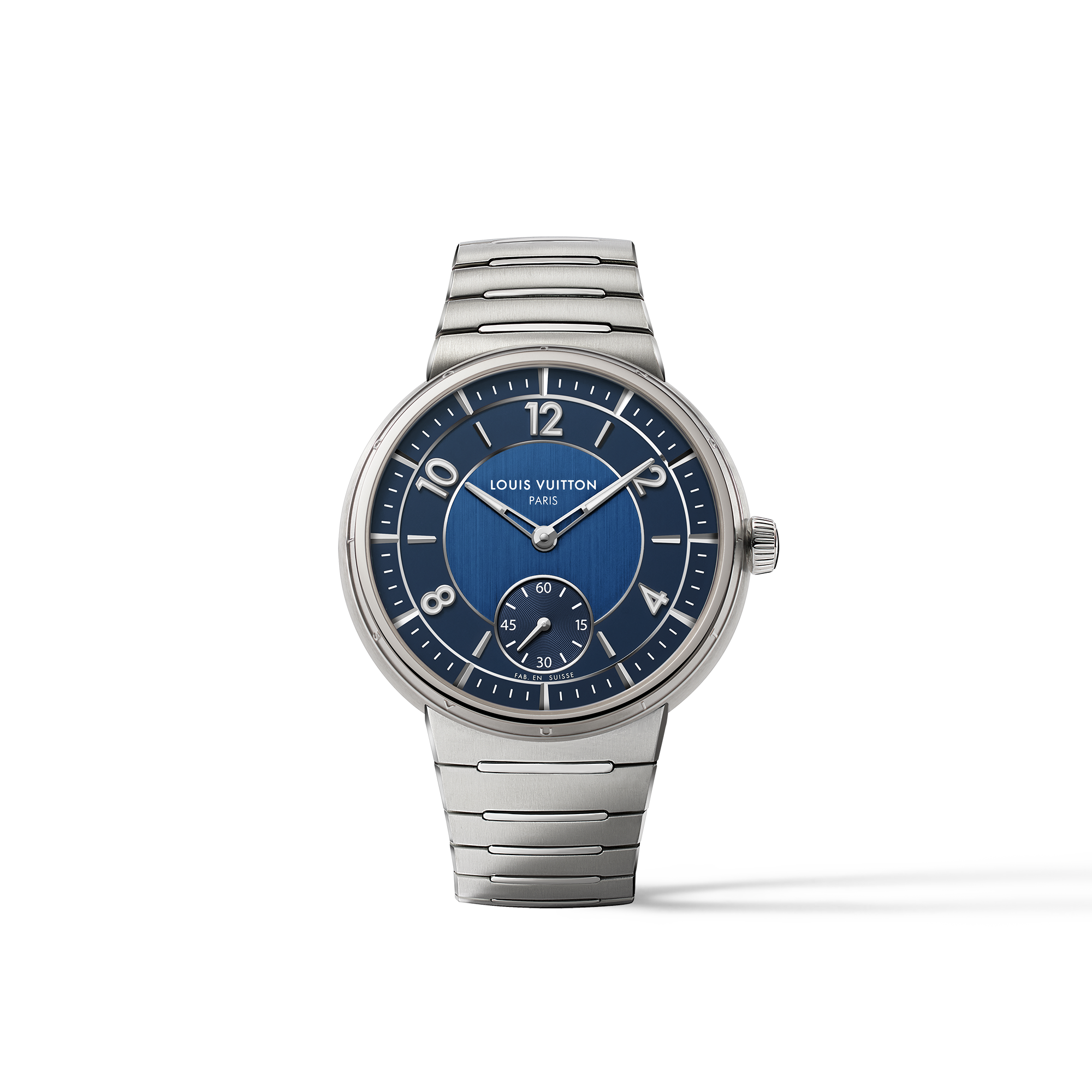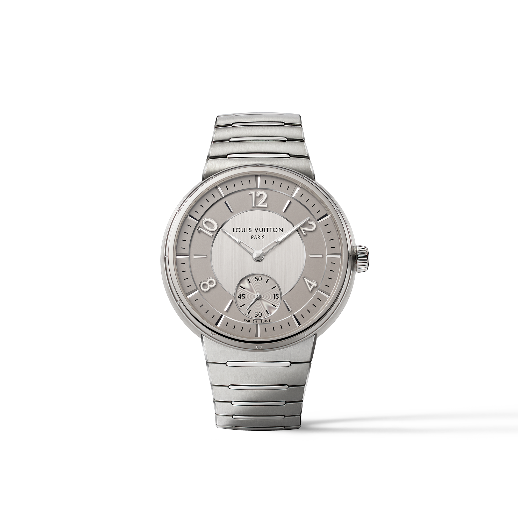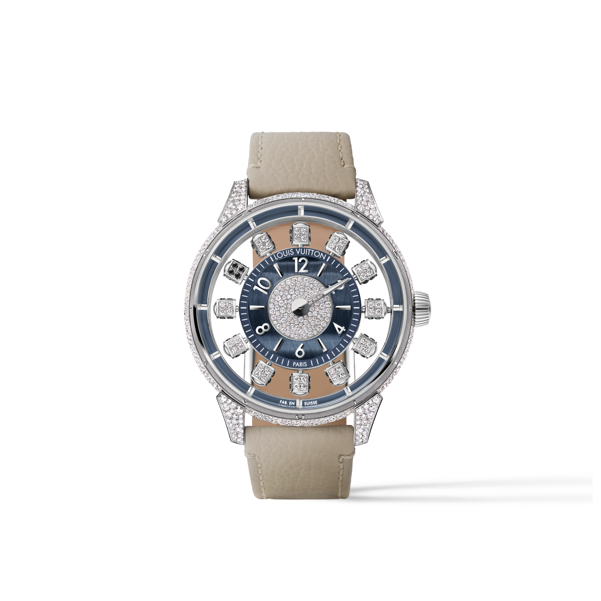 Trở lại với phiên bản mới dành cho cả nam và nữ, đồng hồ biểu tượng Tambour của Maison sở hữu phần vỏ thanh mảnh cùng dây đeo tích hợp lần đầu tiên xuất hiện. Đặc biệt, lớp hoàn thiện tương phản và bộ máy tự động độc quyền do La Fabrique du Temps Louis Vuitton thiết kế.